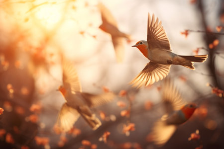 robin in flight over a forest, captured in the style of romantic soft focus and ethereal light. this stunning 8k resolution photograph evokes the essence of baroque animals, reminiscent of nicolaes van verendael's art. the selective focus adds depth and intrigue, while patricia piccinini's digital art techniques bring a unique touch to this mesmerizing image. ai generated
