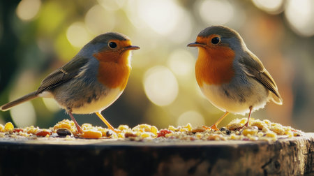 Two European robins standing on wooden surface with scattered seeds in blurry natural background