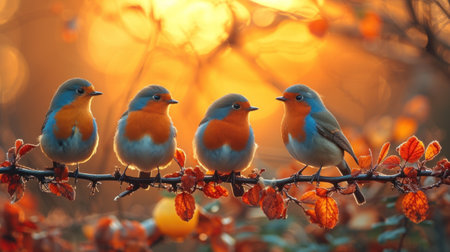 Three robins sitting on a branch in the autumn forest at sunset