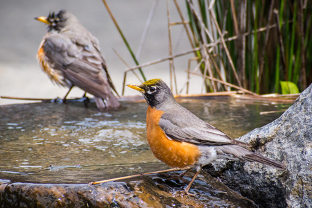 American Robins (Turdus migratorius) taking a bath in a shallow water fountain; San Francisco bay area, California