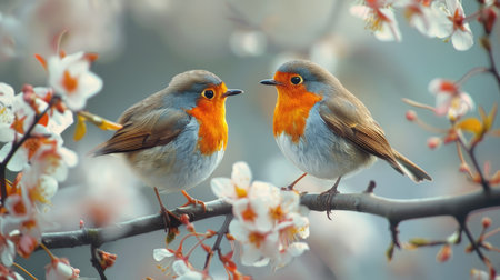 Robin bird perched on cherry blossom branch in springtime