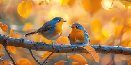 Two small robins on a branch surrounded by vibrant autumn leaves