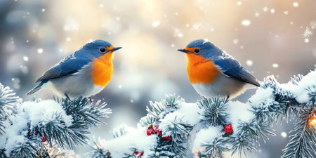 Two Robins in a Wintry Dance, Perched on Snow-Dusted Berries - A Harmony of Nature by Generative AI