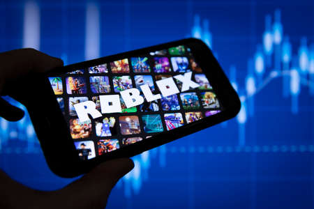 LONDON, UK - March 2021: Roblox game logo in front of stock market chart