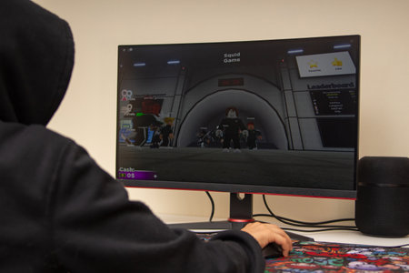 Vilnius, Lithuania - October 09, 2021: Teenager playing video game Squid Game on computer at home. Squid game released in Roblox global gaming platform according to Korean drama series in Netflix