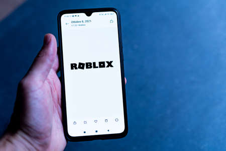 Barcelona, Spain - 13 october 2021: the Roblox app is seen on the screen of a mobile phone hold by hand. Roblox is an online metaverse app