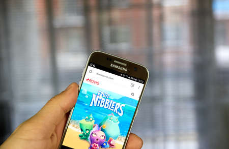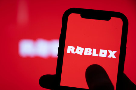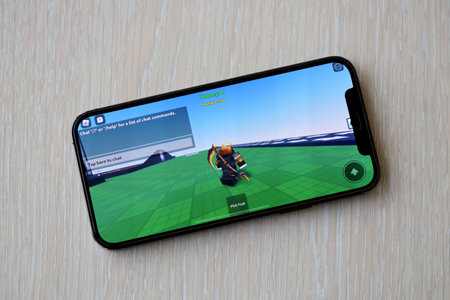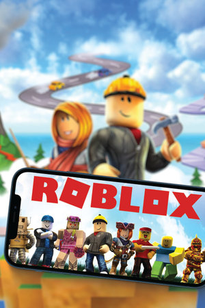 Man holding a smartphone and playing the Roblox mobile game. An illustrative editorial image on a blurry background. Bishkek, Kyrgyzstan - March 14, 2020.