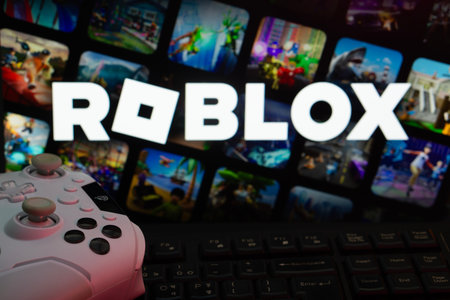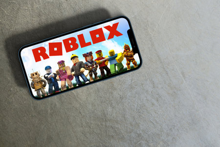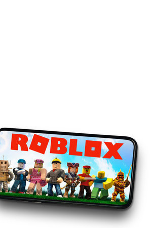 Kazan, Russia - August 25, 2021: Roblox is an online game platform and game creation system. A smartphone with the Roblox logo on the screen surrounded by gamepads.