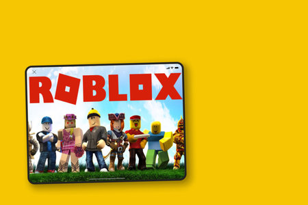 Roblox game app on the iPad screen on yellow background. Top view. Rio de Janeiro, RJ, Brazil. September 2021
