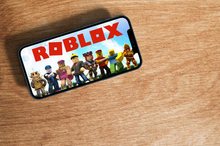 Roblox app on smartphone screen with large shadow marked giving the feeling that you are taller on wooden background. Rio de Janeiro, RJ, Brazil. September 2021.