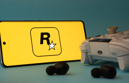 Dhaka, Bangladesh- 17 June 2025: A smartphone with a rockstar games app icon next to a controller and earbuds on a blue surface.