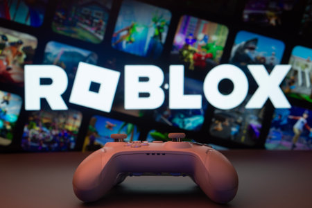 Dhaka, Bangladesh- 26 July 2025: A close-up of a white gamepad with The Roblox seen on screen in the background.