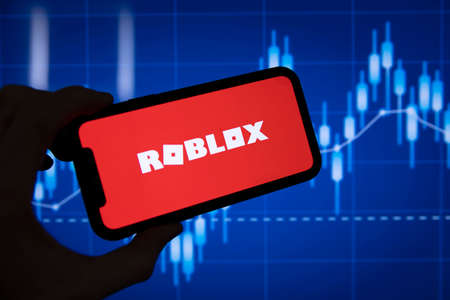 LONDON, UK - March 2021: Roblox game logo in front of stock market chart