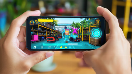 A hand holding a smartphone that displays an augmented reality with colorful, digital art elements overlaying an urban street scene.
