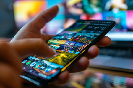 Hand holding illuminated smart phone, close up of touch screen technology generated by artificial intelligence