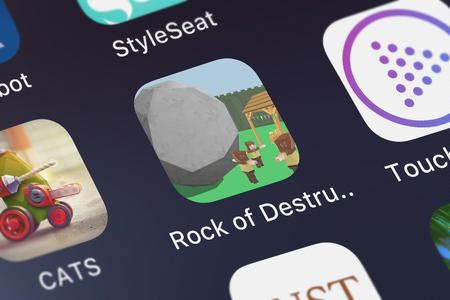 London, United Kingdom - September 29, 2018: Close-up shot of the Rock of Destruction mobile app from Voodoo.