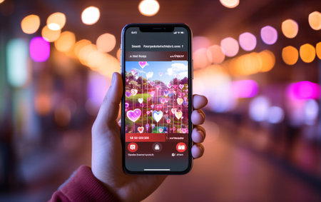 Hand holding mobile phone, capturing illuminated city nightlife with digital display generated by artificial intelligence