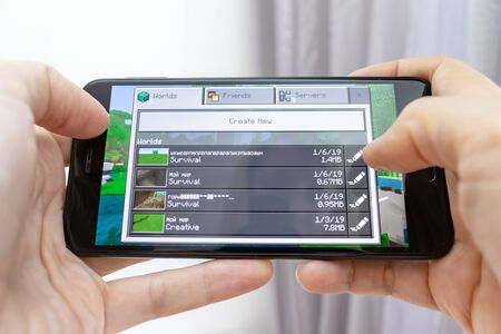 MOSCOW, RUSSIA - JANUARY 08, 2018: Hands holding a smartphone with online multyplayer game Minecraft by Mojang.