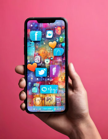 Close-up of a smartphone displaying colorful network graphics, symbolizing connectivity and data exchange.