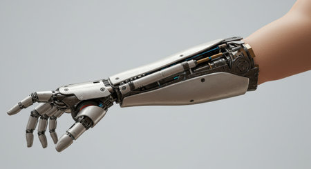 A detailed prosthetic arm operates efficiently, showing cutting edge design and technology in a dynamic outdoor setting.