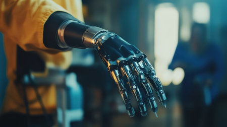 A prosthetic arm is actively engaged in a task within a contemporary medical facility, showing advanced technology and design.