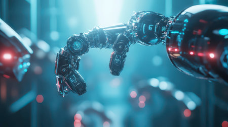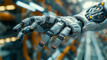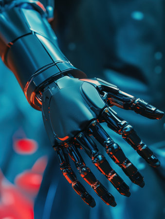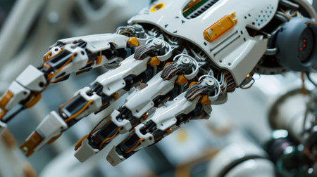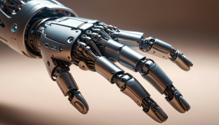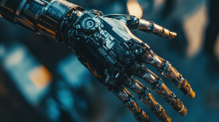 This image features a close-up view of a futuristic robotic hand showcasing intricate mechanical details and advanced technology.