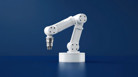 This image features a sleek and modern robotic arm positioned on a vibrant blue background, highlighting its innovative design and capabilities in automation and manufacturing.