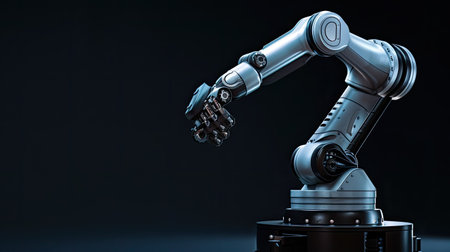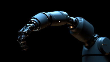 Close-up of a futuristic robotic arm with intricate joints and metallic finish, symbolizing advanced technology and automation.