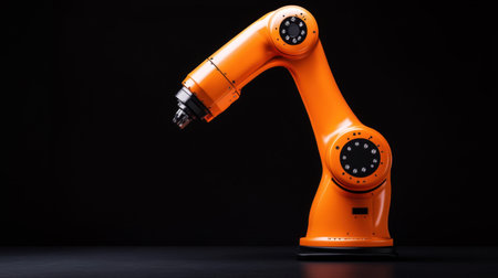 This image features an orange industrial robotic arm set against a dark background, showcasing advanced technology used in modern automation and manufacturing processes.