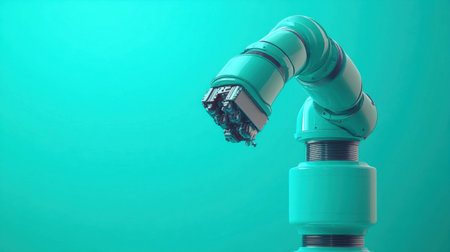 This image showcases a modern robotic arm with a sleek design, set against a vibrant teal background, symbolizing innovation in automation technology.