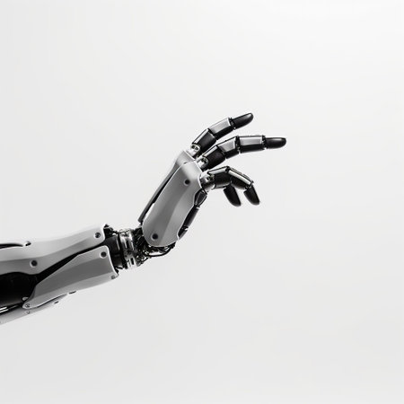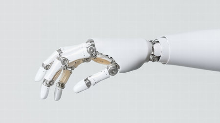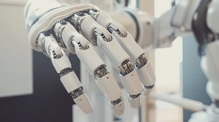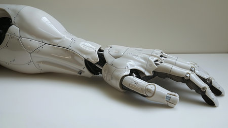 A futuristic robotic hand with sleek design and articulated fingers, showcasing advanced technology and innovation in robotics.