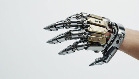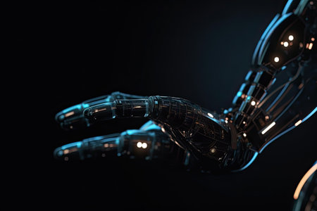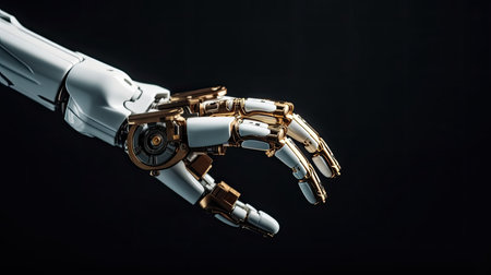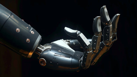 detailed robotic hand, showcasing advanced technology and precision engineering, against a dark background