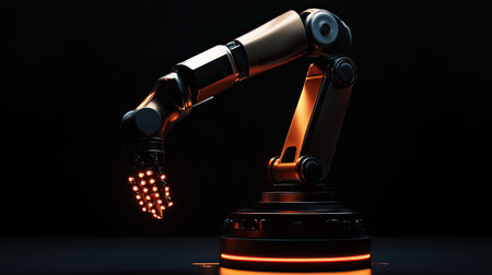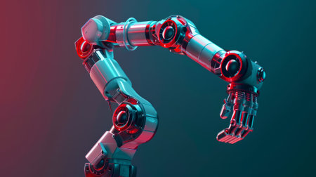 This image showcases a sleek robotic arm, designed with intricate mechanics and glowing LED lights, symbolizing advancements in technology and innovation.