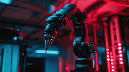 Industrial robotic arm for automated manufacturing in a moden high tech futuristic factory