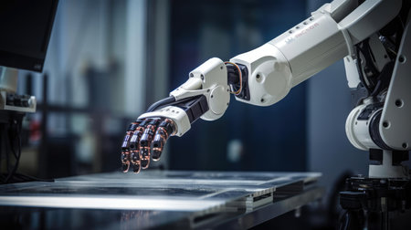 Close up of a robotic arm executing a delicate maneuver, showcasing its intricate design and advanced technology in a laboratory setting