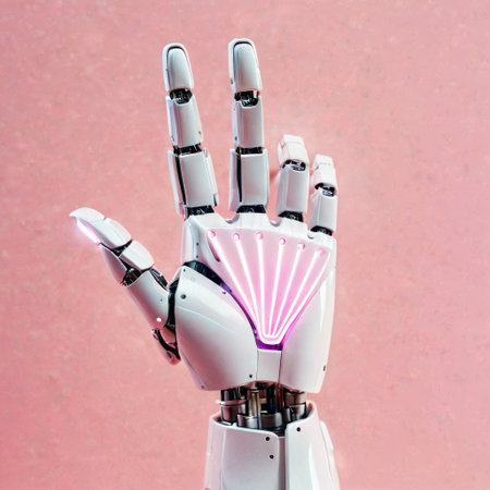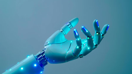 Robotic hand with blue LED lights reaching out against plain background