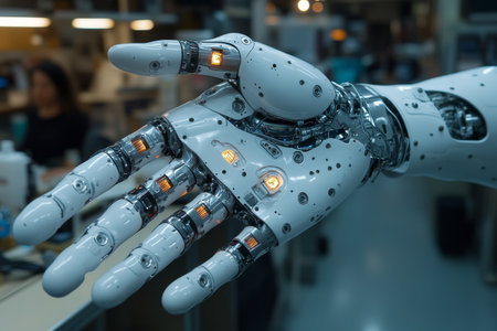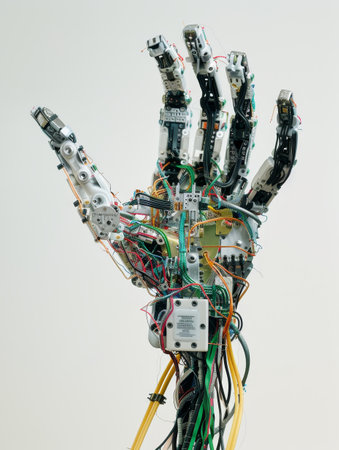 detailed robotic hand, showcasing advanced technology and precision, highlights the intersection of art and artificial intelligence