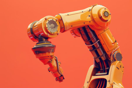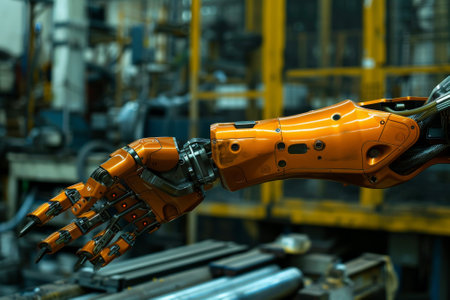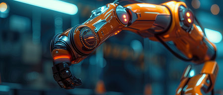 A robotic arm with orange and black parts is shown in a factory setting. Concept of technology and innovation, as well as the potential for automation in various industries