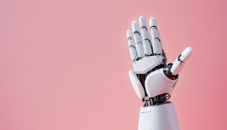 Robotic Hand Raised Against Pink Background