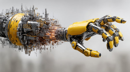 A striking image of a robotic hand showcasing intricate circuitry and mechanical designs on a vibrant yellow background, embodying modern technology.