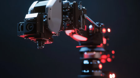 Detail shot of robotic camera arm with LED lighting and stabilization system