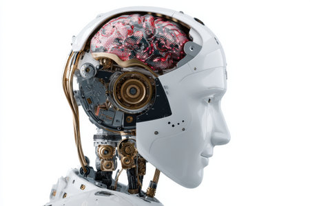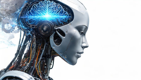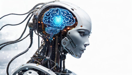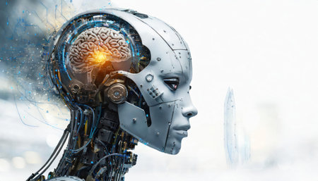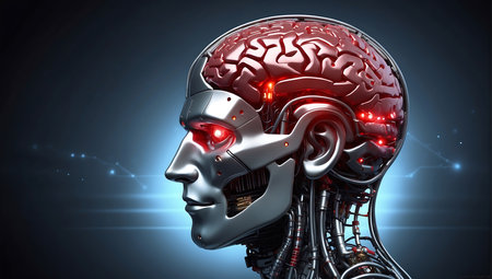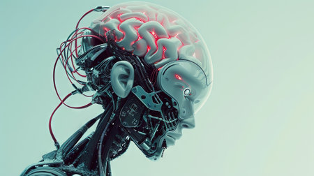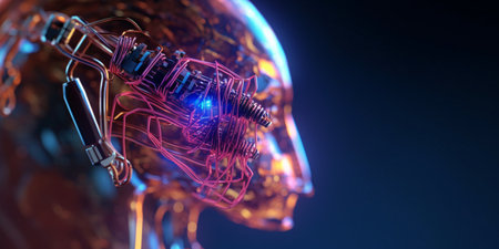 Futuristic robotic head with glowing neural pathways, intricate wiring, and metallic panels. The advanced design highlights artificial intelligence and cutting-edge technology elements