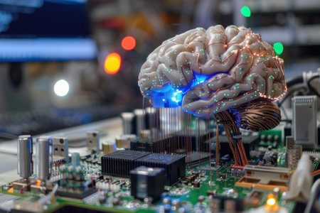 A mesmerizing representation of a brain intertwined with vibrant LED circuits, symbolizing the fusion of technology and intelligence in a modern digital age.