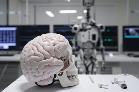 Futuristic Robot Examining Artificial Brain in High-Tech Laboratory Setting During Daylight Hours.