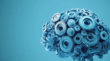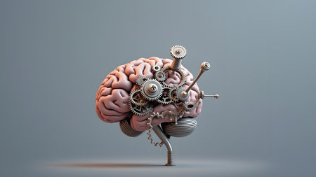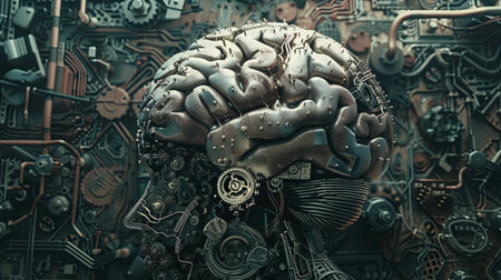 A complex mechanical brain structure with gears and levers, set against a backdrop of gears, symbolizing the intricate workings of the human mind.. AI Generation