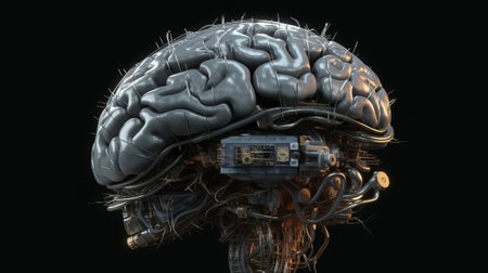 An image showcases a metallic robot with a visible human brain, depicted in profile. The composition features a dark backdrop, emphasizing the robot's silver and grey components. The lighting suggests a studio environment, potentially useful for conceptual illustrations related to technology, artificial intelligence, or future advancements. This could be suitable for editorial and commercial projects.