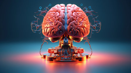 A robot head model with a human brain on it ,3D rendering.Generative AI