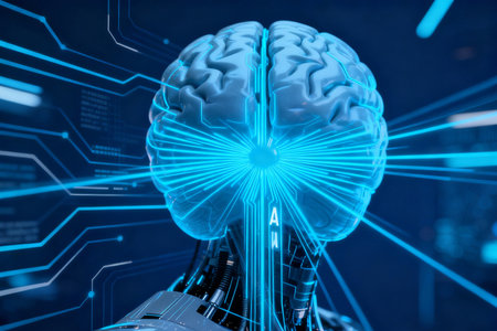 A digital brain merges seamlessly with AI elements like circuits and holographic projections in a high-tech environment, emphasizing innovation.
