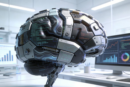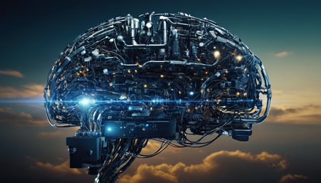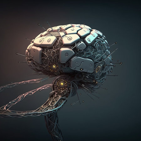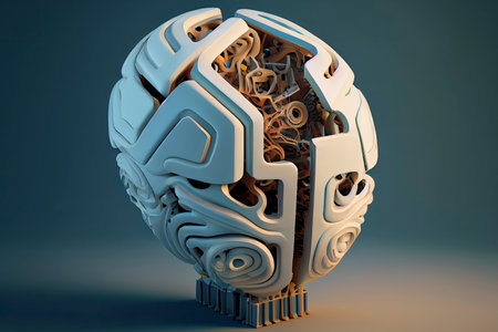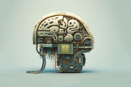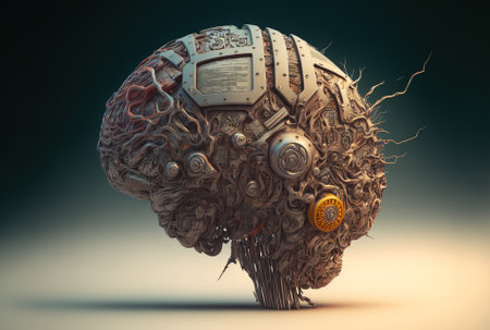 Mechanical brain model with detailed parts, gears, and technological components, representing advanced robotics