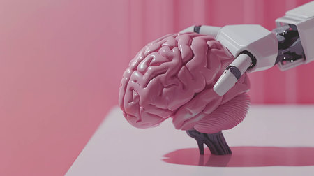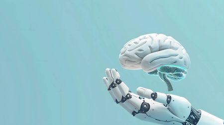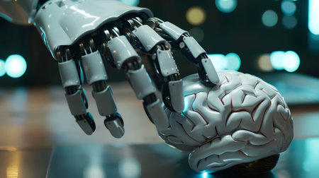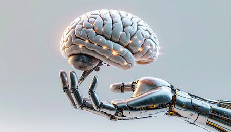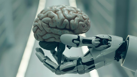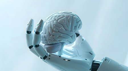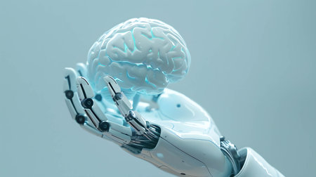 A robotic hand delicately holds a glowing brain, showing advancements in artificial intelligence.